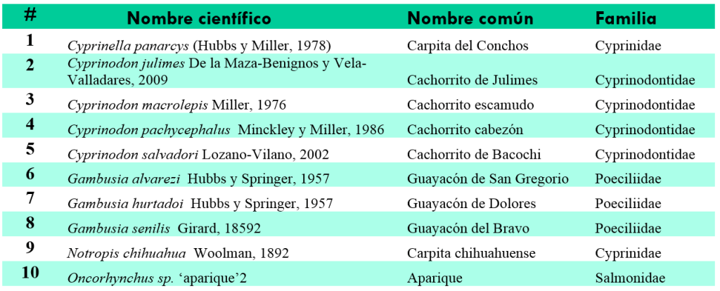De esta lista se observa que las especies se distribuyen en un área reducida y la población tiende a ser pequeña. Un ejemplo de especie endémica es el Cachorrito de Julimes, una especie en peligro de extinción que habita en un área de menos de 1000 m2 en Julimes, Chih., tiene una longitud de 2-3 cm y tiene la peculiaridad que es uno de los peces que habita en las aguas más cálidas del mundo en temperatura de 42 a 48°C [1,]. Información adicional de este pez y otras especies endémicas se encuentra en http://www.naturalista.mx/taxa/206606-Cyprinodon-julimes .