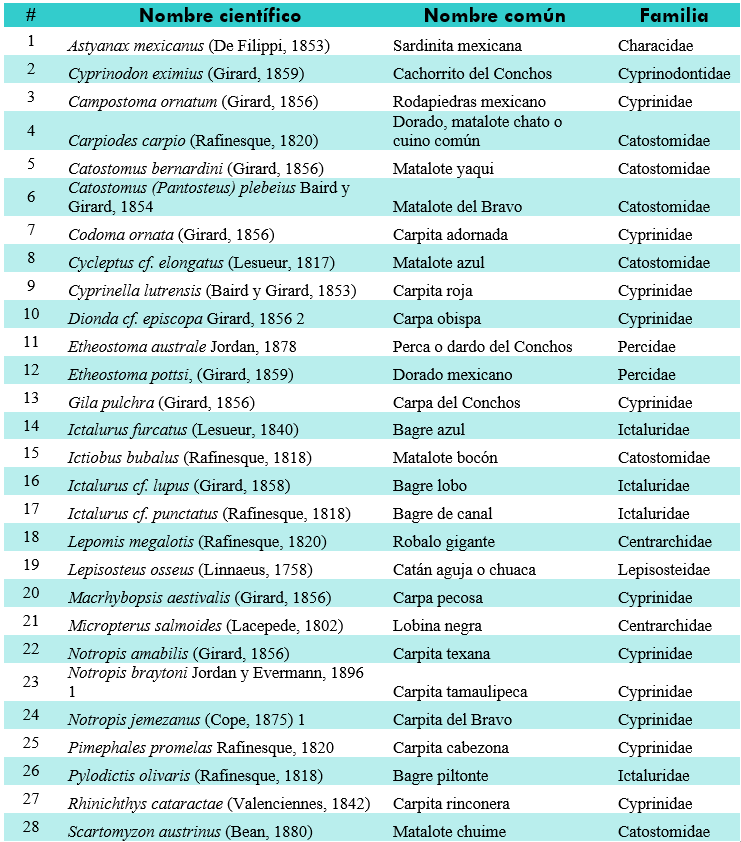 Las tablas anteriores ilustran que el río Conchos es una fuente abudante de especies de peces, de los cuales un alto porcentaje es endémico, pero también que en la actualidad existe un porcentaje muy alto de especies exóticas/invasoras que en ciertas regiones algunas partes han desplazado a las especies nativas. Ademas de esto, el deterioro de los ecosistemas por la extracción de agua, suelo y la contaminación del río representan grandes desafíos.