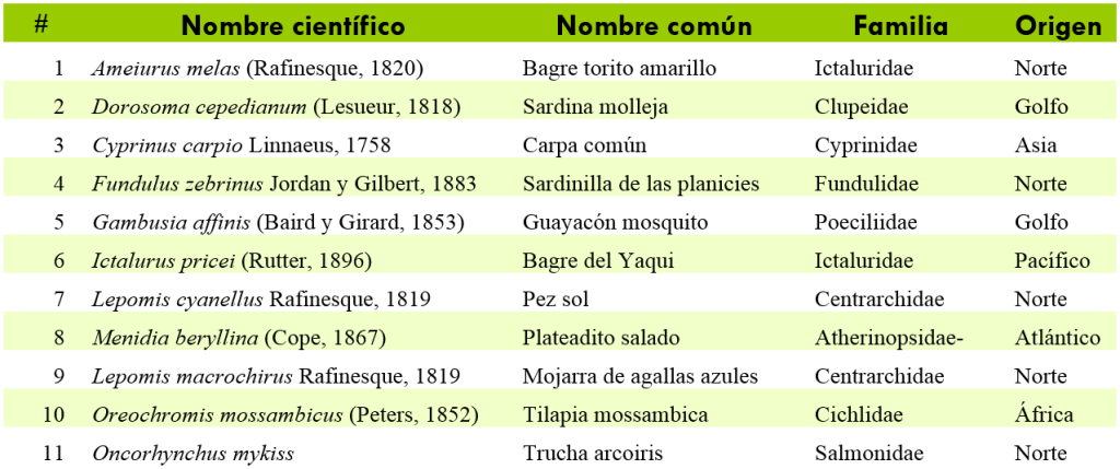 En esta lista se encuentran especies ligeramente más abundantes que las especies endémicas, como el matalote, carpita roja, lobina negra o bagre azul [2].