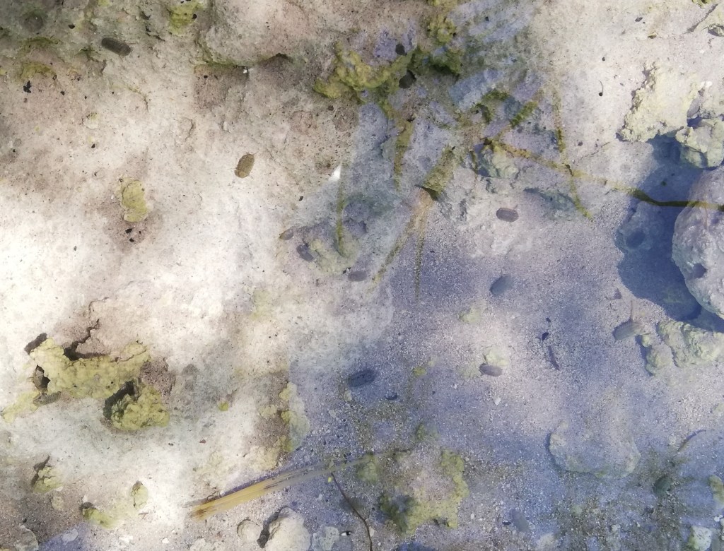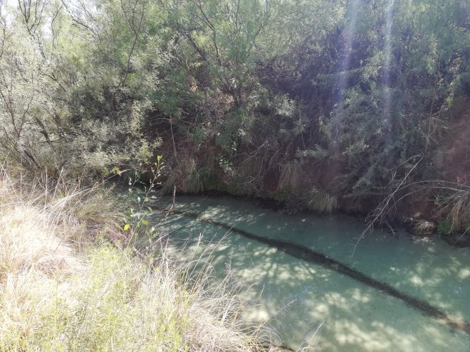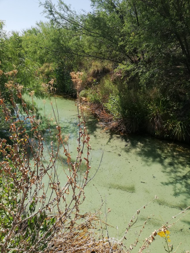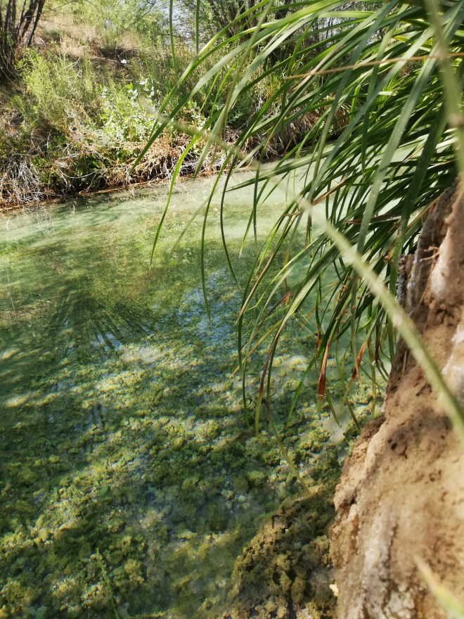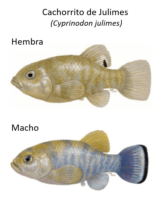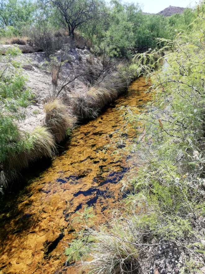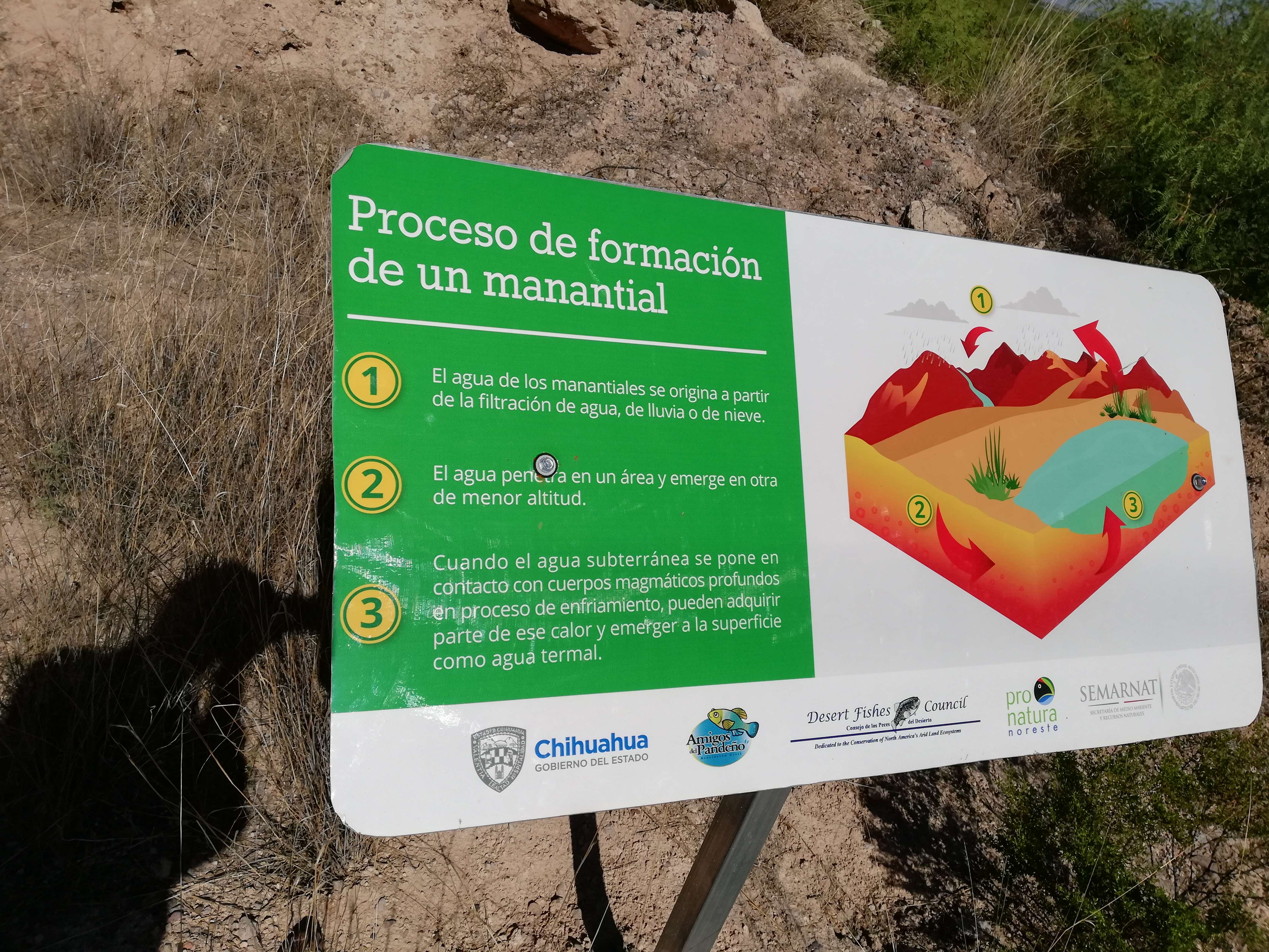 El Pandeño consiste en brotes u “ojitos” por donde brota el agua del suelo a una temperatura de 38-48 °C y con bajos niveles de oxígeno y un sistema de canales que sustenta a las especies endémicas: cachorrito de Julimes (Cyprinodon julimes) (4-6), cochinilla de Julimes (Termosphearoma macrura), caracol de Julimes (Tryona sp.) y al pez Guayacón de Julimes (Gambusia sp.) (3). El color azul, amarillo o verde característico del suelo de los “ojitos” y canales se debe a pigmentos que ciertos microorganismos, llamados cianobacterias, producen para poder utilizar la luz solar y en conjunto con el agua y dióxido de carbono poder producir alimento para sí mismos y oxígeno como subproducto. El oxígeno producido por las cianobacterias ayuda a que las especies mencionadas puedan sobrevivir en las condiciones extremas de los manantiales de Julimes (7). ¿Sabías que las cianobacterias también fueron una fuente importante de oxígeno durante la formación de la atmósfera de la tierra?