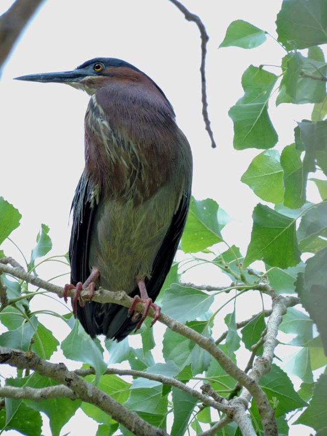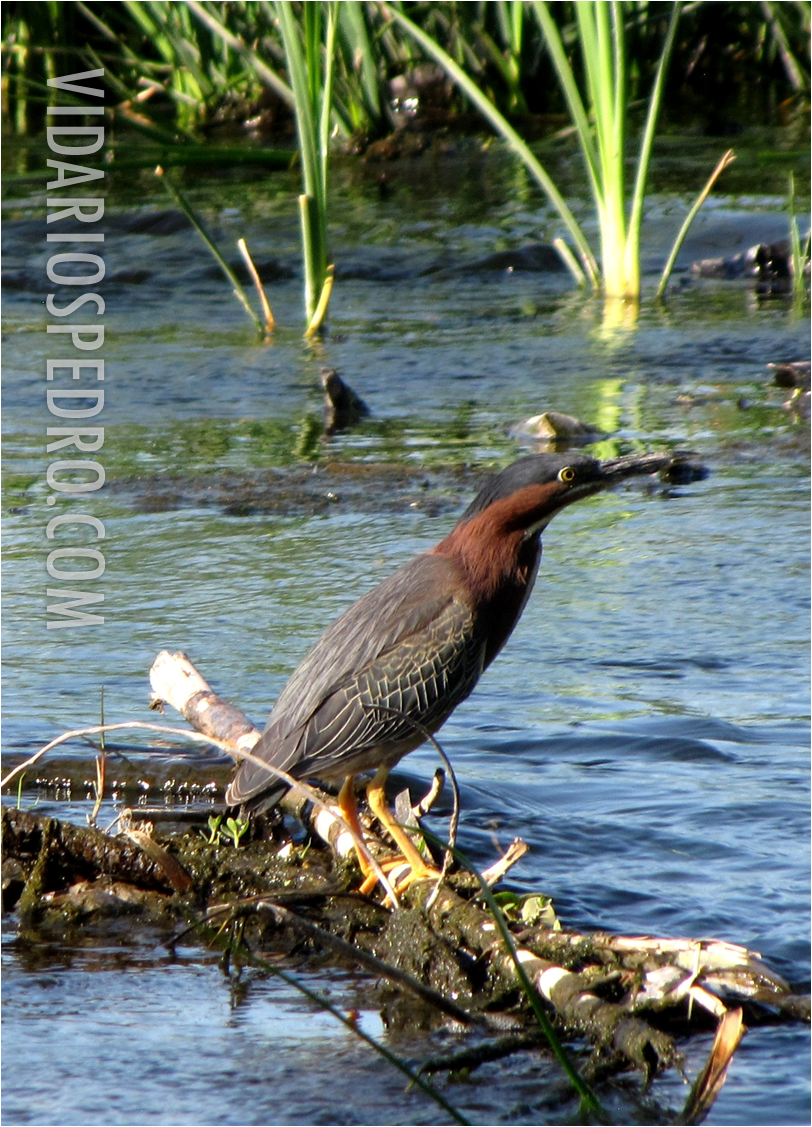 Una de esas ocho garzas es la Garcita Verde (Butorides virescens), la más pequeña de las garzas observadas en Meoqui, mide de 41 a 46 cm, pesa 240 g y tiene una envergadura de 64 a 68 cm. Los nidos, construidos con ramas, carrizo o restos de vegetación del área, generalmente se localizan a no más de 3 metros del borde del agua y la altura a la que se encuentran depende de la vegetación de la zona (3), en esta región es frecuente localizarlos en la parte superior de los álamos.