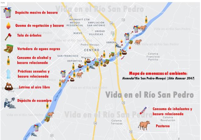 Hace un año Vida en el Río San Pedro denunciaba que no había nada que celebrar en el día de los humedales (1), exponía y demostraba porqué afirmaba que los problemas y la destrucción del sitio Ramsar No. 2047 no solamente no se detenía, sino que aumentaba ante la complicidad de las autoridades. Ya sea porque las mismas autoridades son causantes de los daños (al asfaltar, construir, etc., dentro del área que debería estar protegida); o porque se desentiende de sus obligaciones de vigilancia y conservación, no haciendo valer la ley que representa y permitiendo que: se tire basura, se deposite escombro, se tiren animales muertos, se viertan aguas negras, se talen árboles y un largo y trágico etc. Ver mapa del río San Pedro con las principales amenazas al ambiente más adelante.