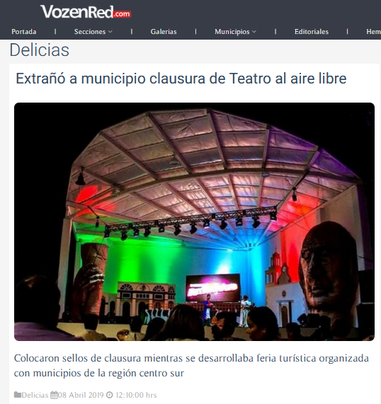 35. Redacción. 2019. Extrañó a municipio clausura de Teatro al aire libre. Voz en Red. [consultado el 30 de enero de 2021]. Disponible en https://www.vozenred.com/2015/notas.php?i=229340
