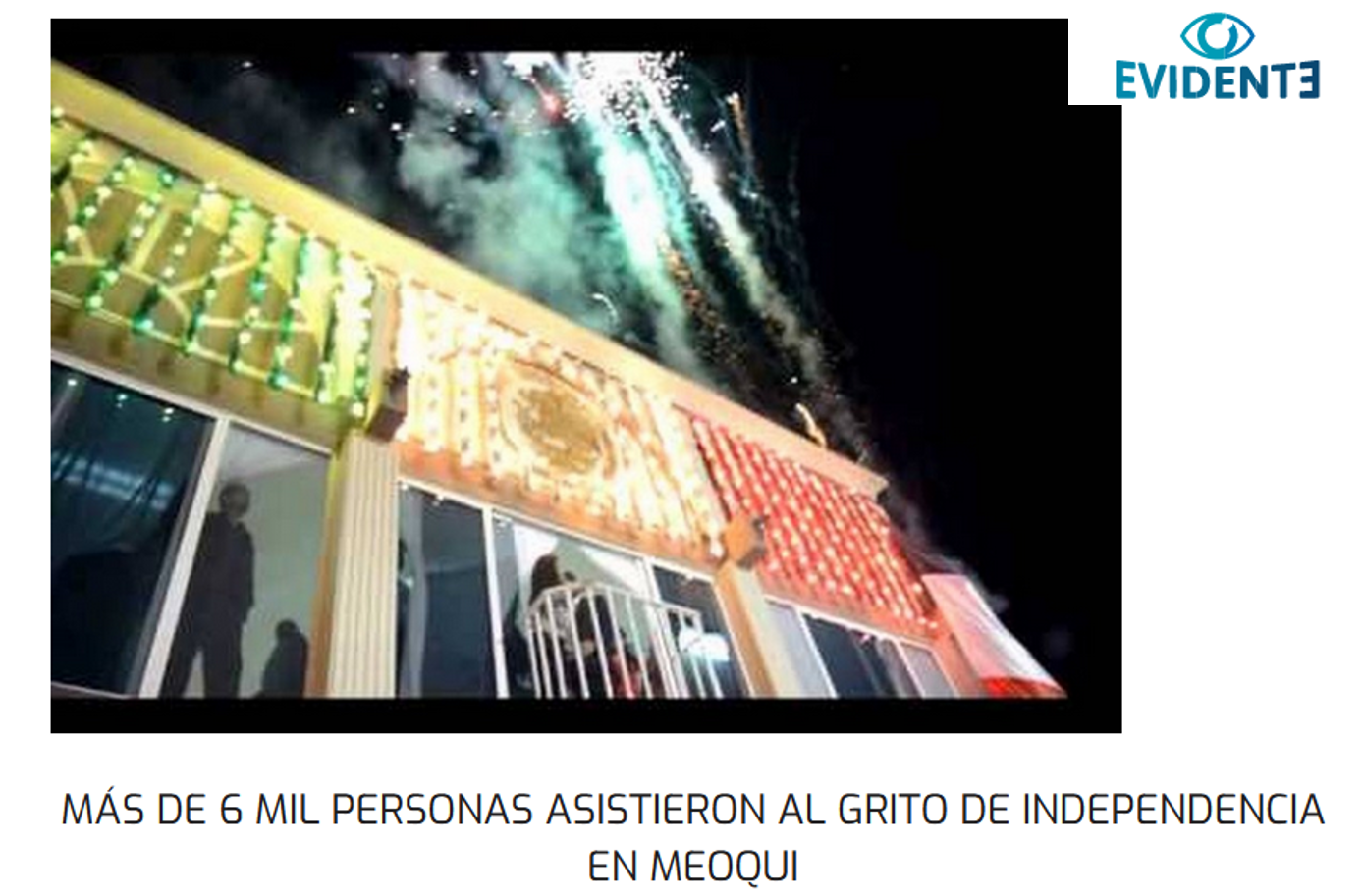 22. Staff. 2018. Más de 6 mil personas asistieron al Grito de Independencia en Meoqui. Evidente. [consultado el 11 de enero de 2021]. Disponible en https://evidente.mx/noticias-destacadas-hidden/541-mas-de-6-mil-personas-asistieron-al-grito-de-independencia-en-meoqui.html
