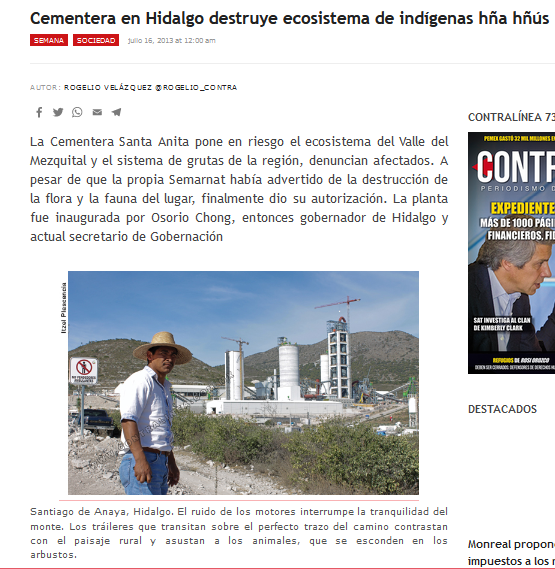 - Velázquez R. (2013). Cementera en Hidalgo destruye ecosistema de indígenas hña hñús. 4 marzo 2021, de Contralínea Sitio web: https://www.contralinea.com.mx/archivo-revista/2013/07/16/cementera-en-hidalgo-destruye-ecosistema-de-indigenas-hna-hnus/