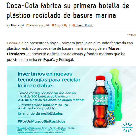 - Retail Actual. (2019). Coca-Cola fabrica su primera botella de plástico reciclado de basura marina. 4 marzo 2021, de Retail Actual Sitio web: https://www.retailactual.com/noticias/20191004/coca-cola-botellas-plasticos-mar#.YEmUidxJ-JJ