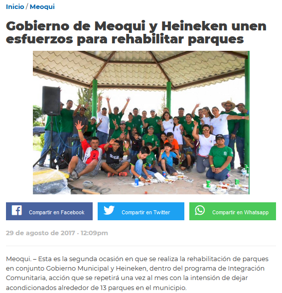 - Redacción. (2017). Gobierno de Meoqui y Heineken unen esfuerzos para rehabilitar parques. 4 marzo 2021, de cambio.gob.mx Sitio web: http://www.cambio.gob.mx/redchihuahua/spip.php?article103