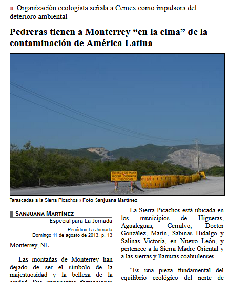 - Martínez S. (2013). Pedreras tienen a Monterrey «en la cima» de la contaminación de América Latina. 4 marzo 2021, de La Jornada Sitio web: https://www.jornada.com.mx/2013/08/11/politica/013n1pol