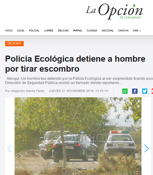 - García Ferrel A. (2019). Policía Ecológica detiene a hombre por tirar escombro. 4 marzo 2021, de La Opción de Chihuahua Sitio web: https://laopcion.com.mx/delicias/policia-ecologica-detiene-a-hombre-por-tirar-escombro-20191121-253990.html