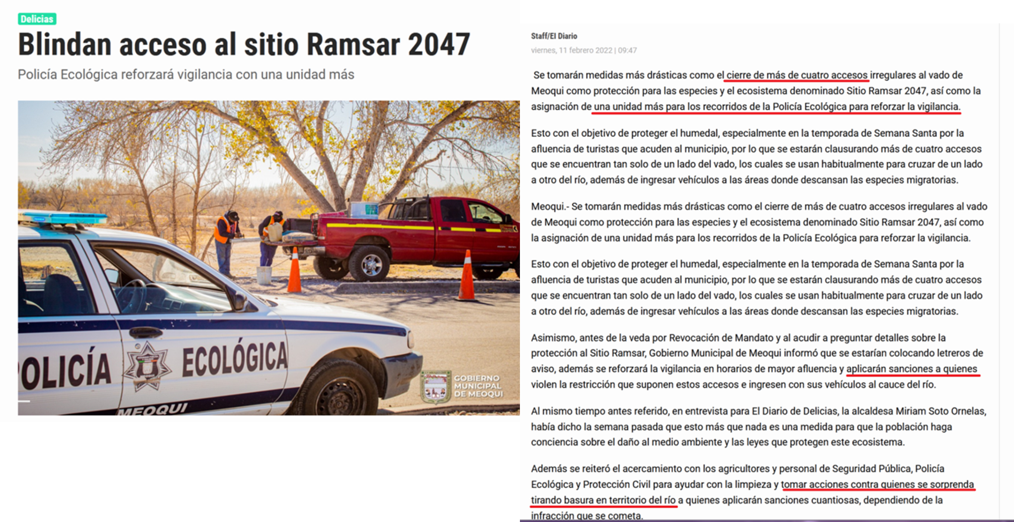 - Ponce, S. (2022). Cierran accesos al Humedal de Meoqui . 22 de marzo de 2022, de El Heraldo de Chihuahua Sitio web: https://www.elheraldodechihuahua.com.mx/local/delicias/cierran-accesos-al-humedal-de-meoqui-8017468.html