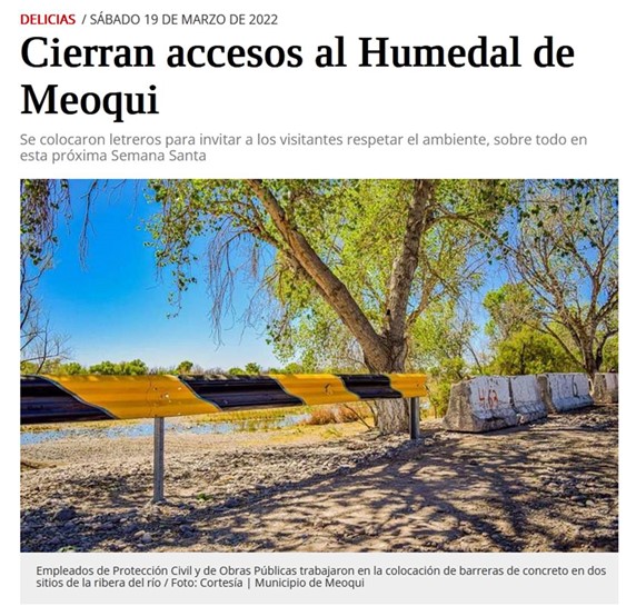 - Ponce, S. (2022). Cierran accesos al Humedal de Meoqui . 20 de marzo de 2022, de El Heraldo de Chihuahua Sitio web: https://www.elheraldodechihuahua.com.mx/local/delicias/cierran-accesos-al-humedal-de-meoqui-7849049.html