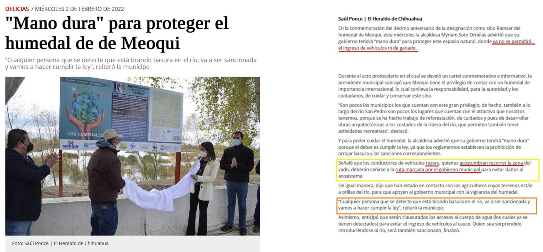 - Ponce, S. (2022). «Mano dura» para proteger el humedal de de Meoqui . 21 de marzo de 2022, de El Heraldo de Chihuahua Sitio web: https://www.elheraldodechihuahua.com.mx/local/delicias/mano-dura-para-proteger-el-humedal-de-de-meoqui-7814074.html