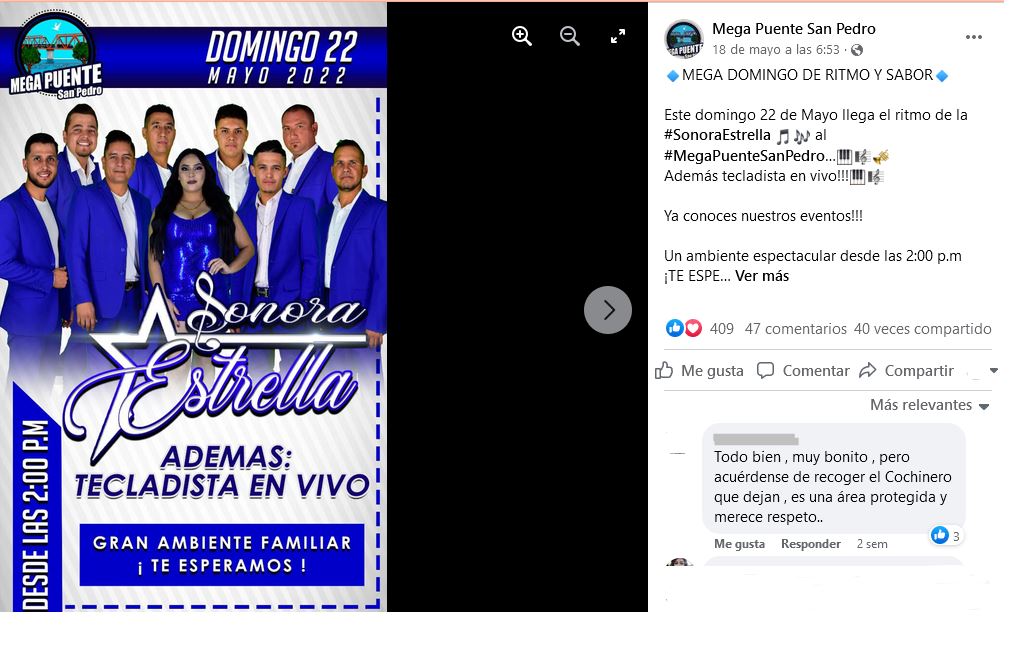 4. […] Ya hemos denunciado y mostrado por qué la realización de eventos en las áreas naturales es  dañina para los ecosistemas. Puede encontrar información en los artículos: “Continúa la organización de eventos que producen contaminación acústica, lumínica y basura en el río San Pedro” y “Contaminación acústica y lumínica en el río San Pedro”. […]