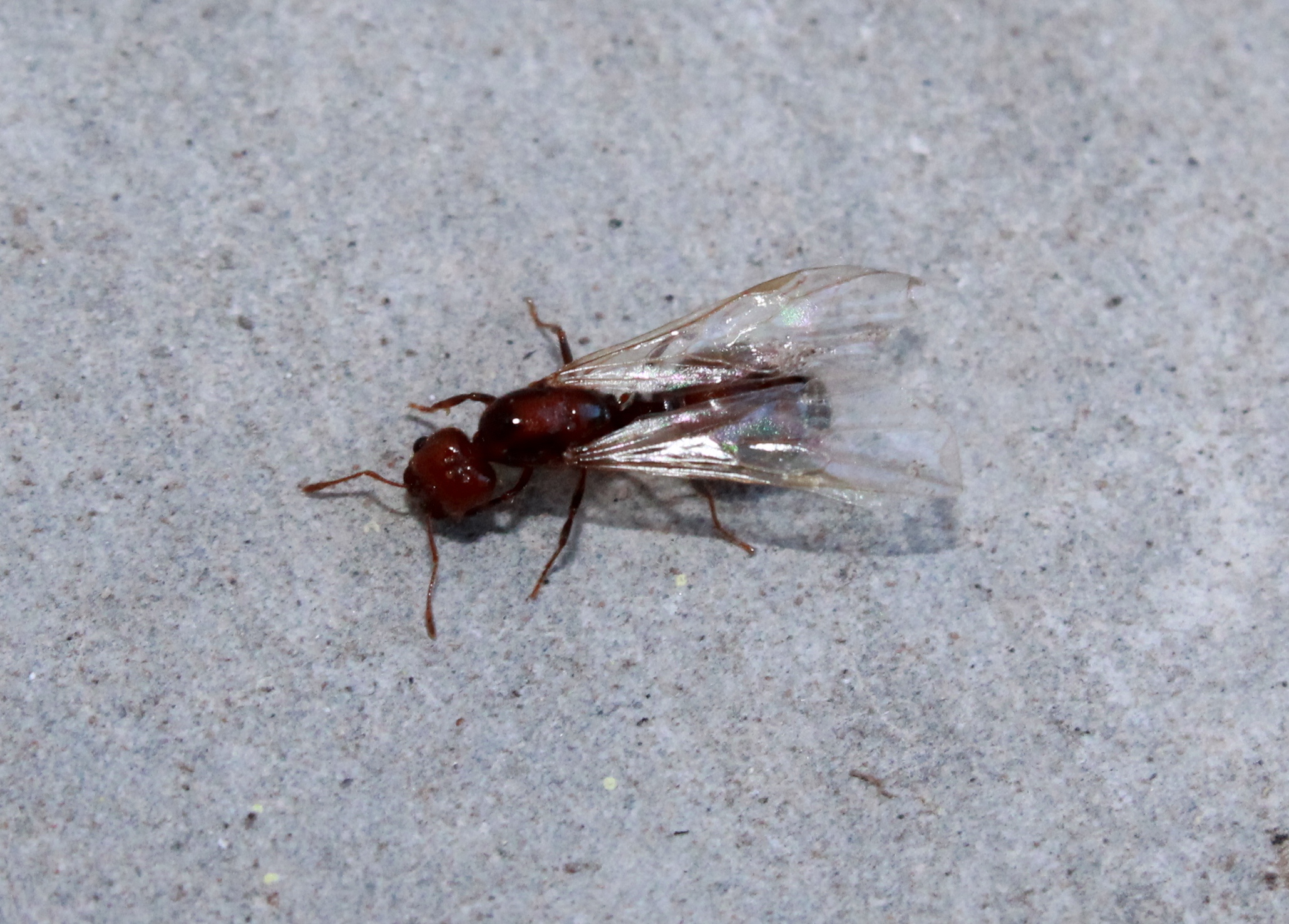 Una colonia comienza con el vuelo nupcial de la reina. La época reproductiva se inicia generalmente cuando el clima es favorable, las colonias maduras liberan miles de hormigas aladas (reinas vírgenes y machos) que salen volando en busca de machos de otras colonias para aparearse. Las reinas pueden aparearse con uno o varios machos y almacenar desde 7 hasta 300 millones de espermatozoides en una bolsa llamada espermateca. Ahí, los espermatozoides se mezclan y permanecen en estado suspendido toda la vida de la reina. 1