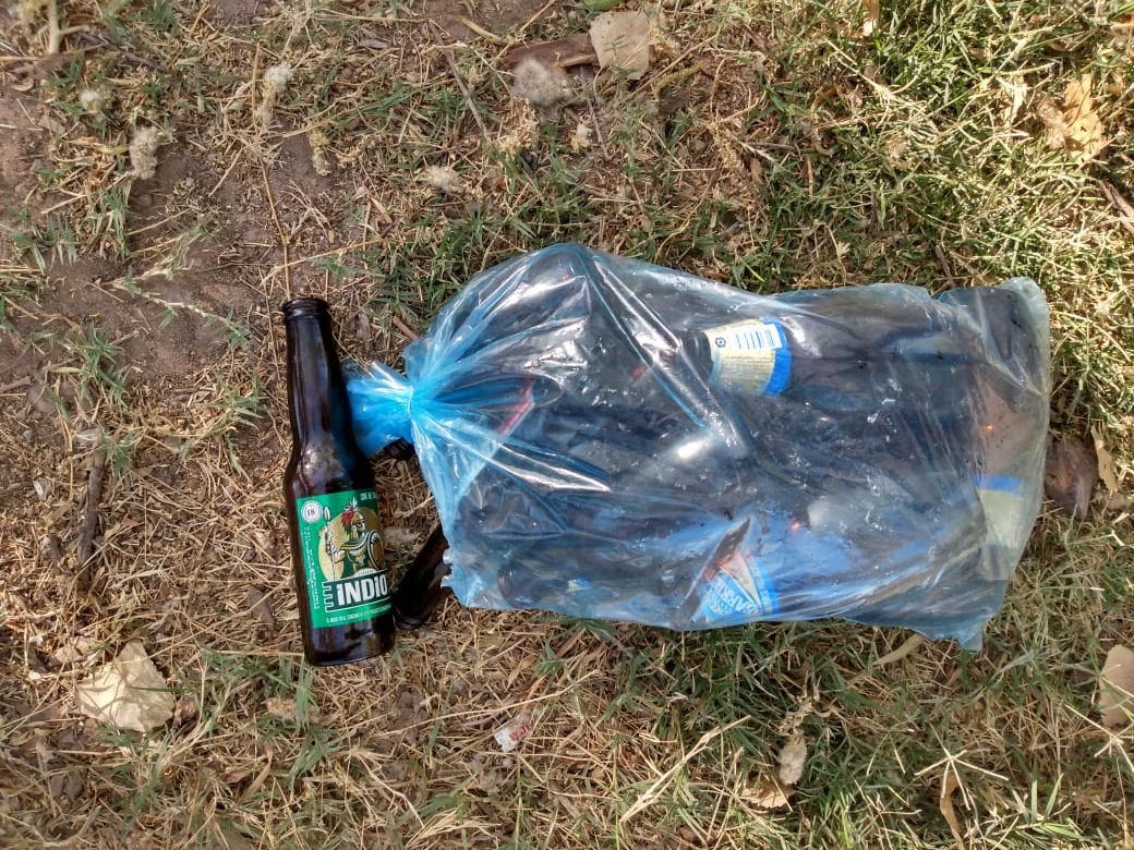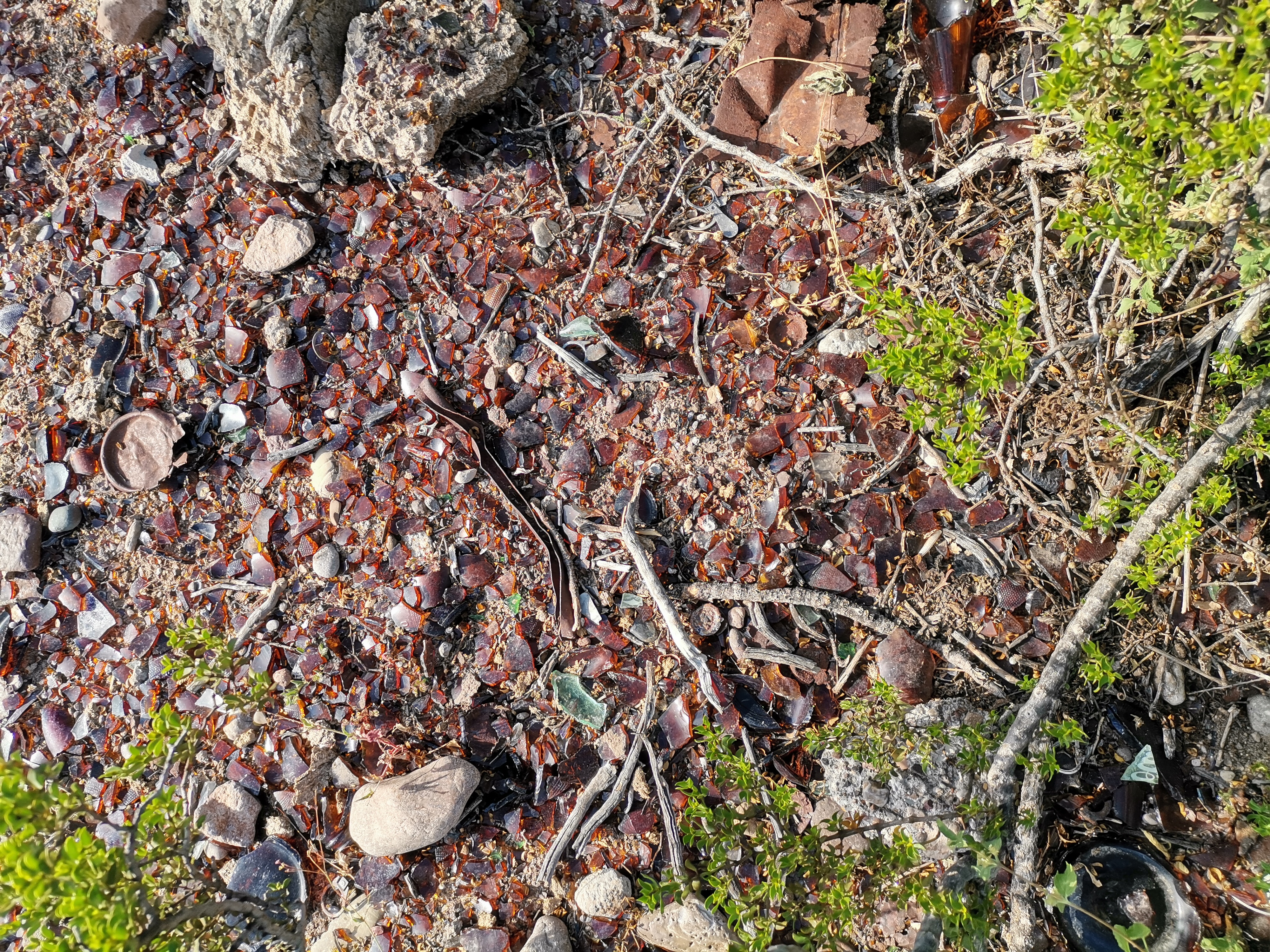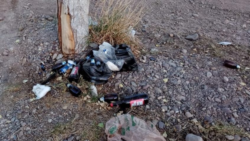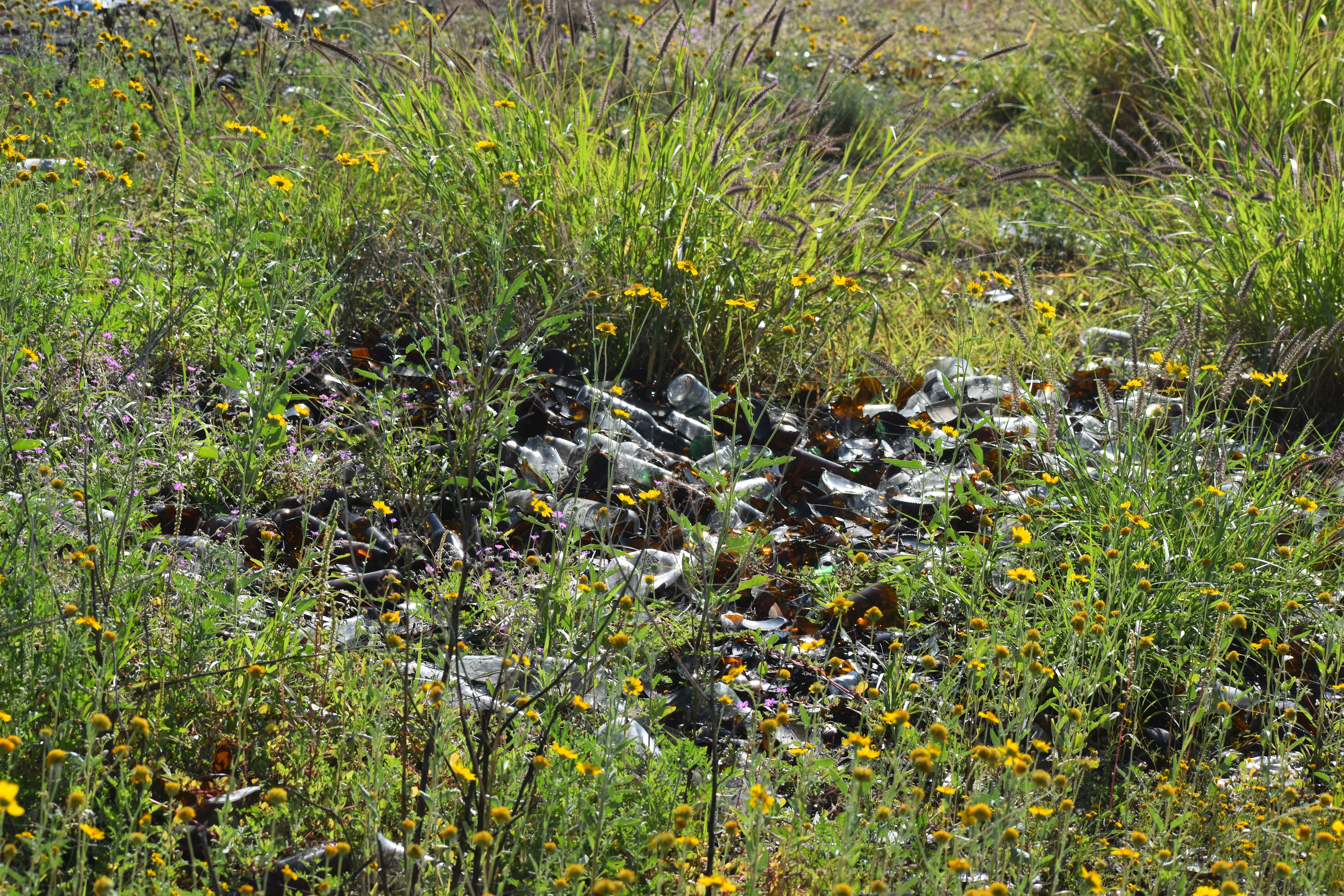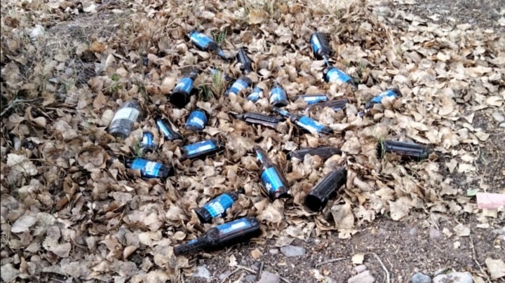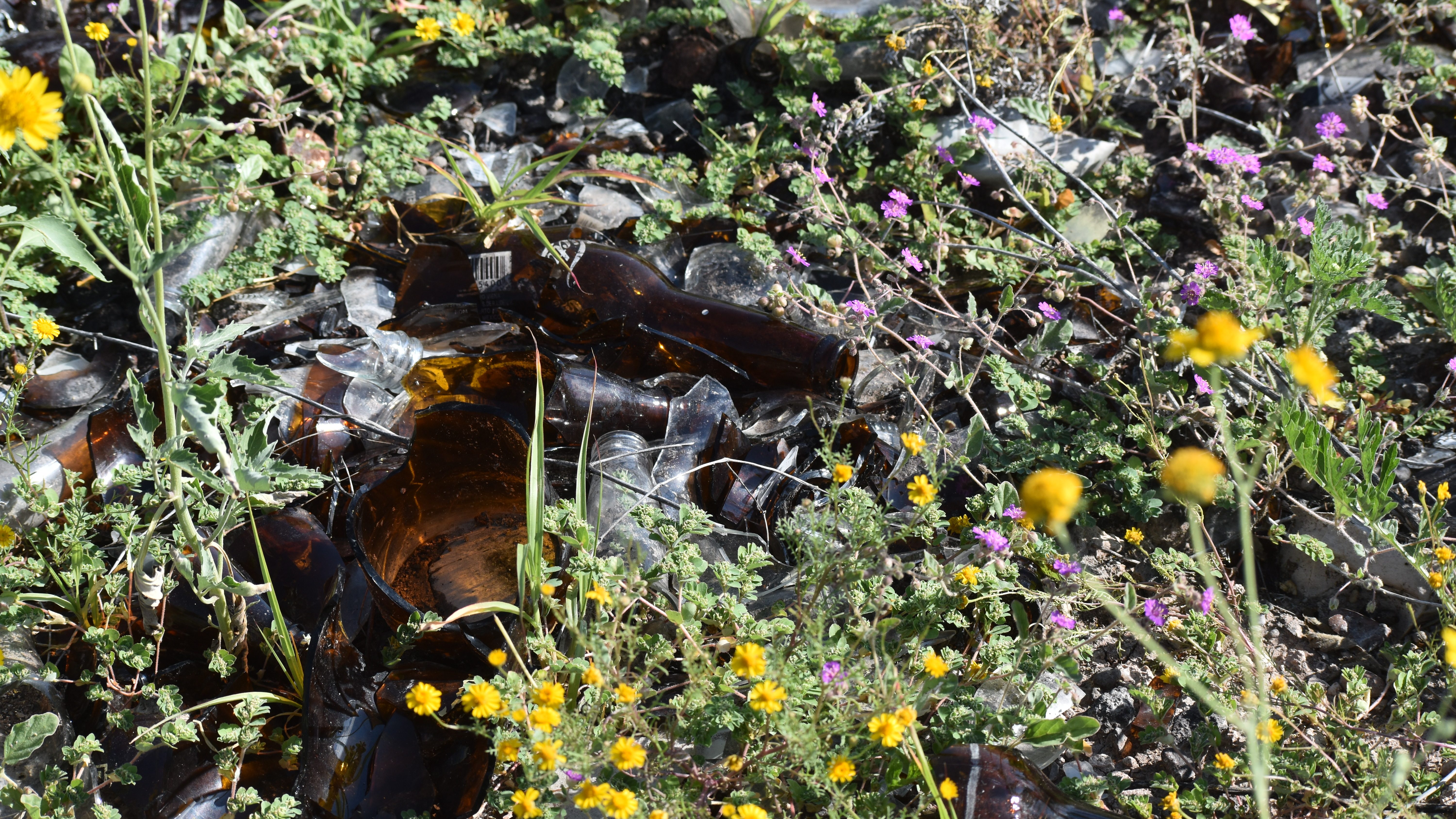 Tiradero de botellas de vidrio en áreas naturales de la región, mostrando que este material no es frecuentemente reciclado.