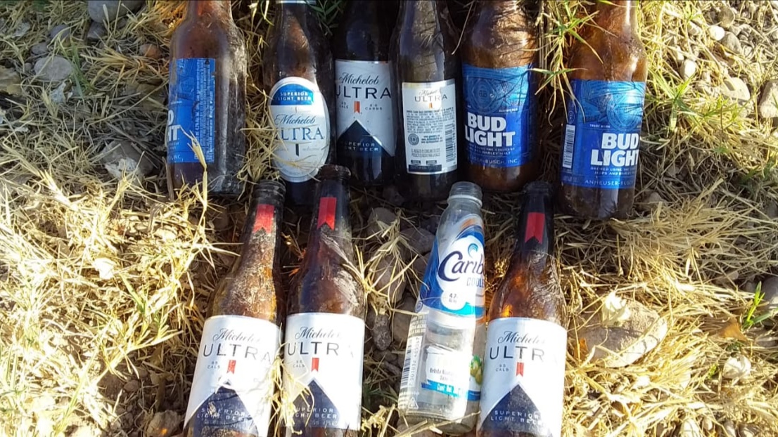 Botellas de vidrio de bebidas alcohólicas en el río San Pedro, Meoqui, Chihuahua. Esta escena es frecuente observarla en casi cualquier área del río.