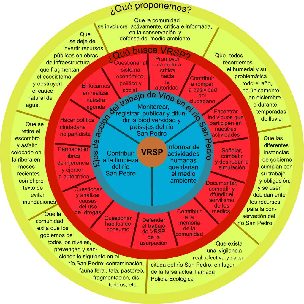 c) Nuestra organización busca contribuir a la limpieza del río San Pedro a través de una campaña permanente de recolección de basura. En ya casi tres años hemos retirado cientos de toneladas de basura que de otra manera seguirían ahí. Estamos en contra de que las campañas de limpieza del río San Pedro sean utilizadas por personas o instituciones de cualquier índole (civiles, gubernamentales o privadas) con fines publicitarios o para simular que hay planes de trabajo. En el caso de las instancias gubernamentales el limpiar y preservar es una obligación legal que incumplen, en el caso de la población y cualquier otra organización, es una obligación moral y ética que se omite. Además, por lo general son esfuerzos muy esporádicos y aislados, no hay continuidad ni fondo. VRSP considera que, en aspectos como la contaminación por basura o ruido, por ejemplo, la ciudadanía puede contribuir a aminorar su impacto, siendo distinto para otra problemática como: la fauna feral, la descarga de agua residual o la deposición de escombro, cuya atribución es gubernamental.