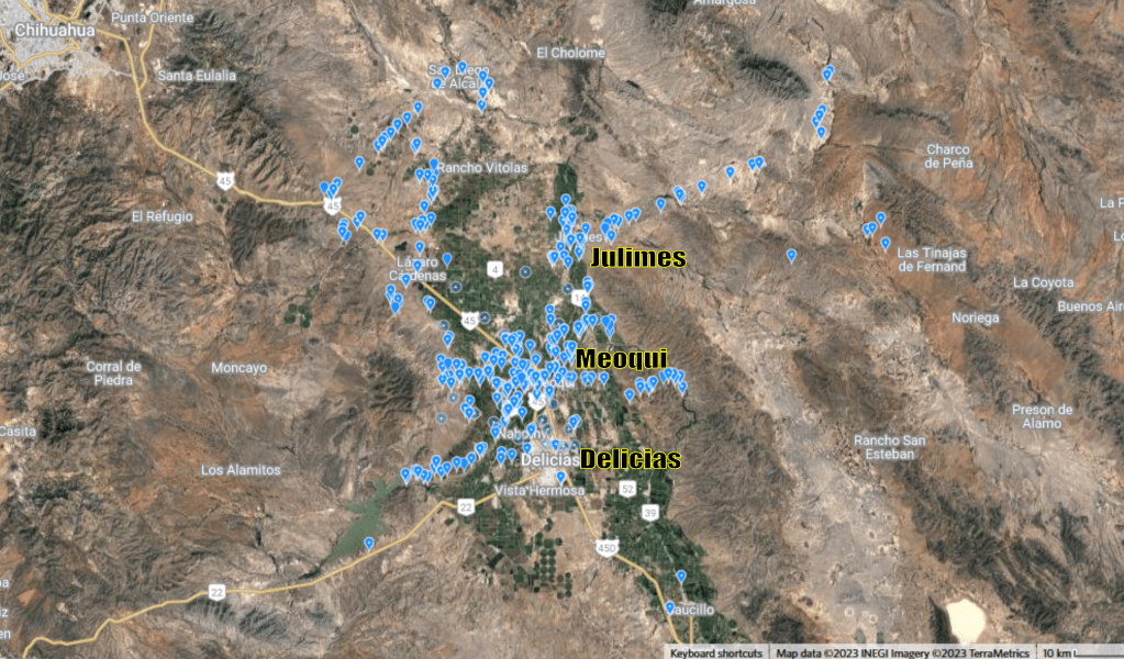 Este resumen anual señala la riqueza biológica presente en la región, contraria a la idea de que “en la región no hay nada”, basta prestar atención al entorno para darnos cuenta. En la figura 2 indicamos las principales zonas que hemos recorrido en los 4 años anteriores y que incluyen ríos, cerros, pastizales, áreas agrícolas y áreas urbanizadas. Los municipios en nuestra área de estudio incluyen a Meoqui, Rosales, Saucillo, Julimes, Delicias, Aldama y Camargo.