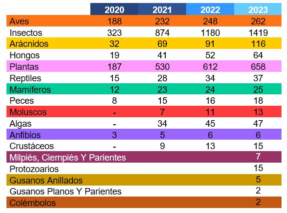 La tabla 1 y figura 1 ilustran un incremento en casi todas las categorías taxonómicas presentadas, hacemos la observación de que no se trata de confirmaciones de especies nuevas, sino de registros de especies de las que no se contaba con evidencia fotográfica o que estuviera depositada en alguna base de datos pública. En este caso, todas las observaciones se encuentran depositadas en el portal de ciencia ciudadana Naturalista, y pueden ser consultadas en el proyecto “Biodiversidad de las cuencas del río San Pedro y del río Conchos”