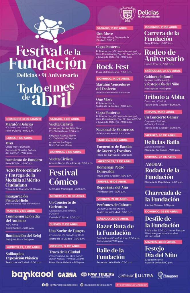 - Delicias H. Ayuntamiento (21 de marzo de 2024). Presentan calendario de actividades del Festival de la Fundación Delicias en su 91 aniversario. Delicias H. Ayuntamiento. Recuperado de https://municipiodelicias.com/noticias/2674-presentan-calendario-de-actividades-del-festival-de-la-fundacion-delicias-en-su-91-aniversario.html