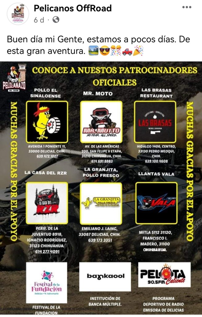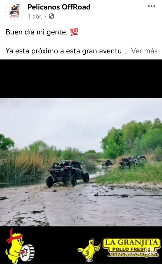 Y para variar, aquí festejar es destruir: como si fuera algo para presumir, en medios de comunicación local como El Diario de Delicias y Reporte Regional (1-2), se anuncia la tercera edición de la carrera de vehículos todo terreno llamada “El Pelicanazo 2024”, con la participación de más de 400 vehículos, por distintas áreas naturales de la región; no es difícil de imaginar, ni se requiere mucho conocimiento para saber lo que ocasionarán más de 400 vehículos de este tipo (y de cualquiera en realidad) circulando por diferentes áreas naturales (las pocas que quedan, por cierto).