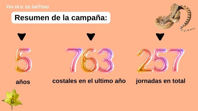 5 años después, nuestra organización continúa con la campaña: el 19 de julio de 2025 marca el 5º aniversario de este esfuerzo voluntario de resistir a la degradación del humedal. El trabajo de las personas que se han sumado a la iniciativa durante algún fin de semana, un periodo determinado o de forma permanente se refleja en los 763 costales y bolsas de basura que hemos retirado del río San Pedro únicamente en el último año.